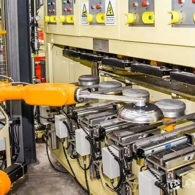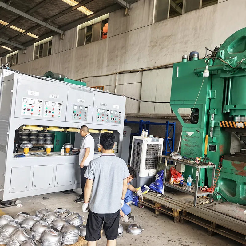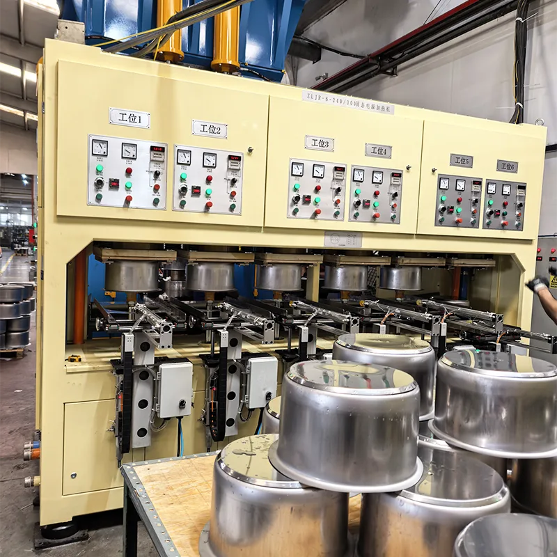 Tapak kerja syarikat terkenal mengeluarkan periuk keluli tahan karat menggunakan mesin pemanas berputar