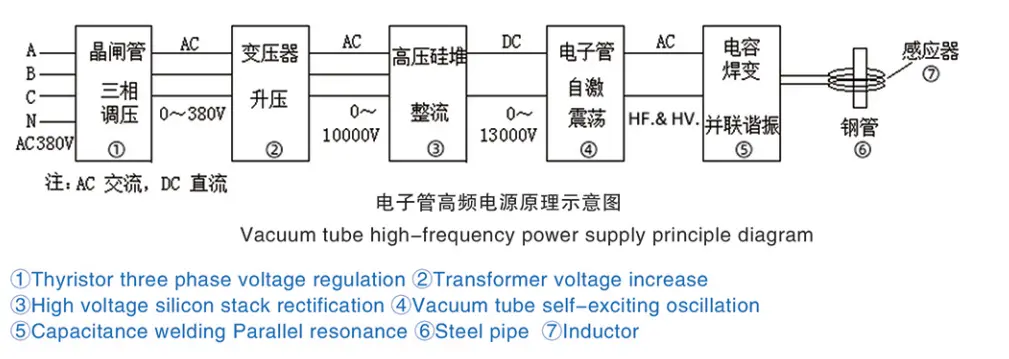 AC industri biasa (wayar tiga fasa empat 380V/50HZ di China) ditukar kepada AC boleh laras antara 0 hingga 380V (frekuensi tidak berubah) melalui pengatur voltan AC thyristor, dan kemudian ditingkatkan sehingga hampir 10000V voltan tinggi (frekuensi tidak berubah) oleh litar tegak voltan tinggi, dan kemudiannya dilaraskan voltan tinggi voltan tinggi. DC, dan kemudian diayunkan oleh tiub vakum kepada arus HF dan HV, dan kemudian melalui resonans selari LC untuk menguatkan arus berayun, dan selepas bekalan pengurangan voltan kepada induktor yang digunakan untuk pemanasan paip keluli dan bahan kerja lain dll.