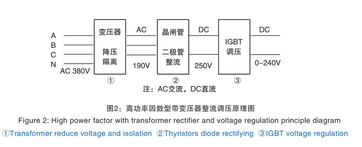 1. Dikelaskan dengan membetulkan peraturan voltan: Thyristors(SCR) boleh digunakan untuk melengkapkan pembetulan serentak dan peraturan voltan, atau mula-mula menggunakan diod atau thyristor membetulkan dan kemudian menggunakan voltan kawal IGBT. Gunakan IGBT regulate voltan adalah untuk menambah baik faktor peralatan.boleh menjimatkan elektrik dan meningkatkan lagi kualiti kimpalan.